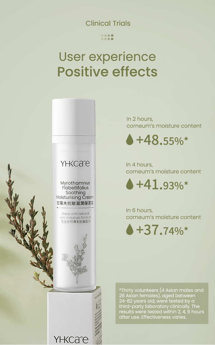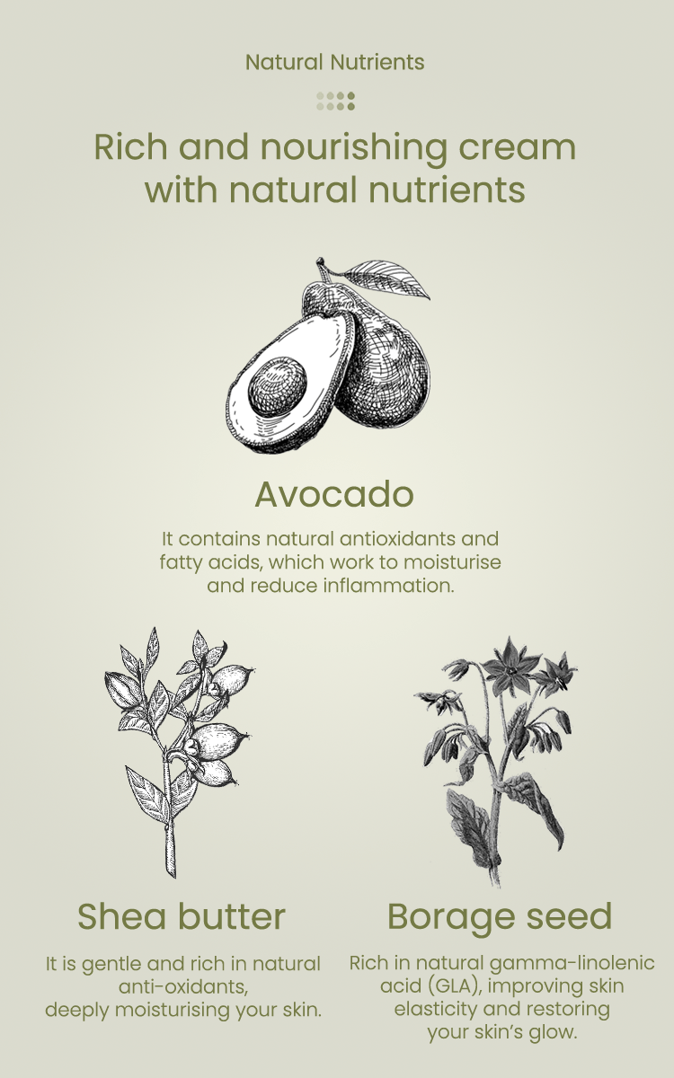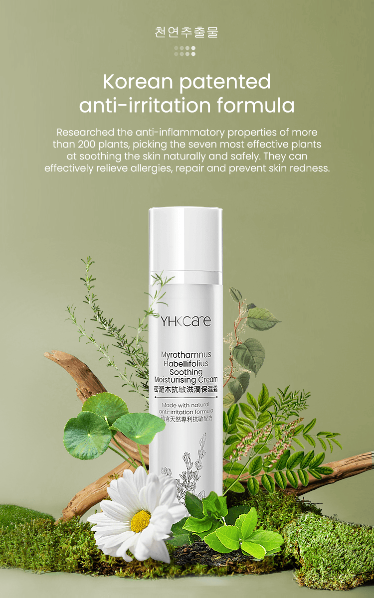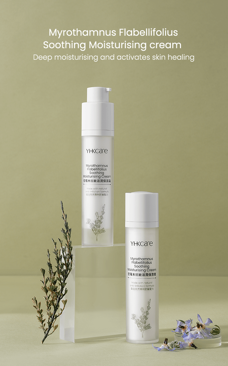 Our Myrothamnus Flabellifolius Soothing Moisturising Cream is rich in shea butterˆ, avocado oilˆ, borage seed oilˆ, and precious myrothamnus flabellifolius plant stem cells. Pure nutrients from the Myrothamnus Flabellifolius leaf are extracted using callus culture extract technology. They can effectively regenerate the skin’s vital energy, anti-oxidation capacity, and lighten wrinkles. Shea butter can effectively moisturise and nourish the skin (clinically tested — skin moisture content increased by 48.55%*); avocado oil combined with borage seed oil soothes and calms sensitive skin and strengthens the skin's own protective barrier. In addition, the moisturising cream also deliberately added a patented Korean natural anti-irritant plant extract formula. Experiments show that the formula has a soothing effect on inflamed skin. Our ingredients use natural emulsifiers and no preservatives, leaving no greasy feeling. Skin is left feeling rejuvenated, protected, looking younger and firmer.