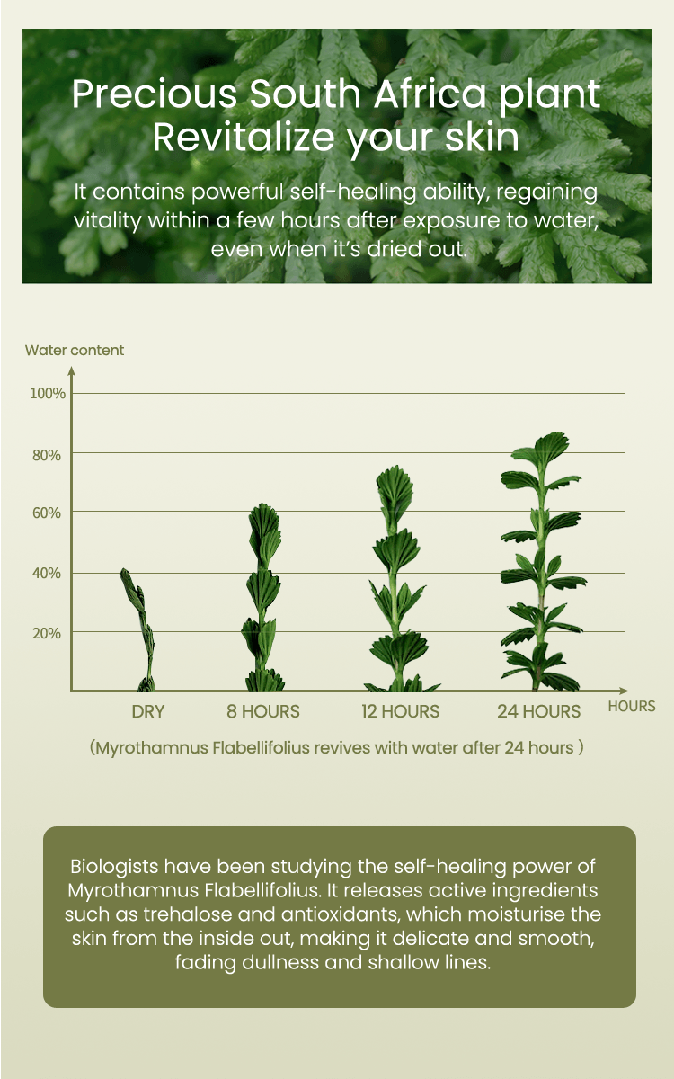Myrothamnus Flabellifolius contains rich regenerating elements, which easily penetrate the shin's surface improving the skin's ability to repair itself, lightening lines, and improving skin radiance.